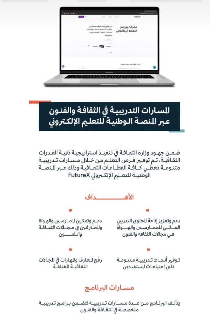 ضمن جهود وزارة الثقافة في تنفيذ استراتيجية تنميةالقدرات ألثقافية تم توفير فرص التعلم من خلال مسارات تدريبية متنوعة تغطي كافة القطاعات ألثقافية وذلك عبر المنصة الوطنية للتعليم الإلكتروني Futurex
