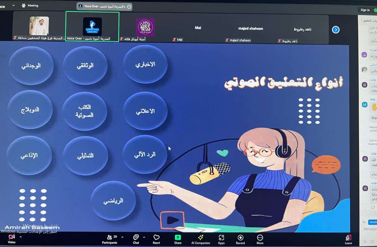 وبيّنت المدربة أميرة باسيم بأن هذه الورش التدريبية تسهم في إتاحة المجال للعديد من الخامات الصوتية الراغبة في التعلم وإتقان التعليق الصوتي في البرامج الإنتاجية المتنوعة.