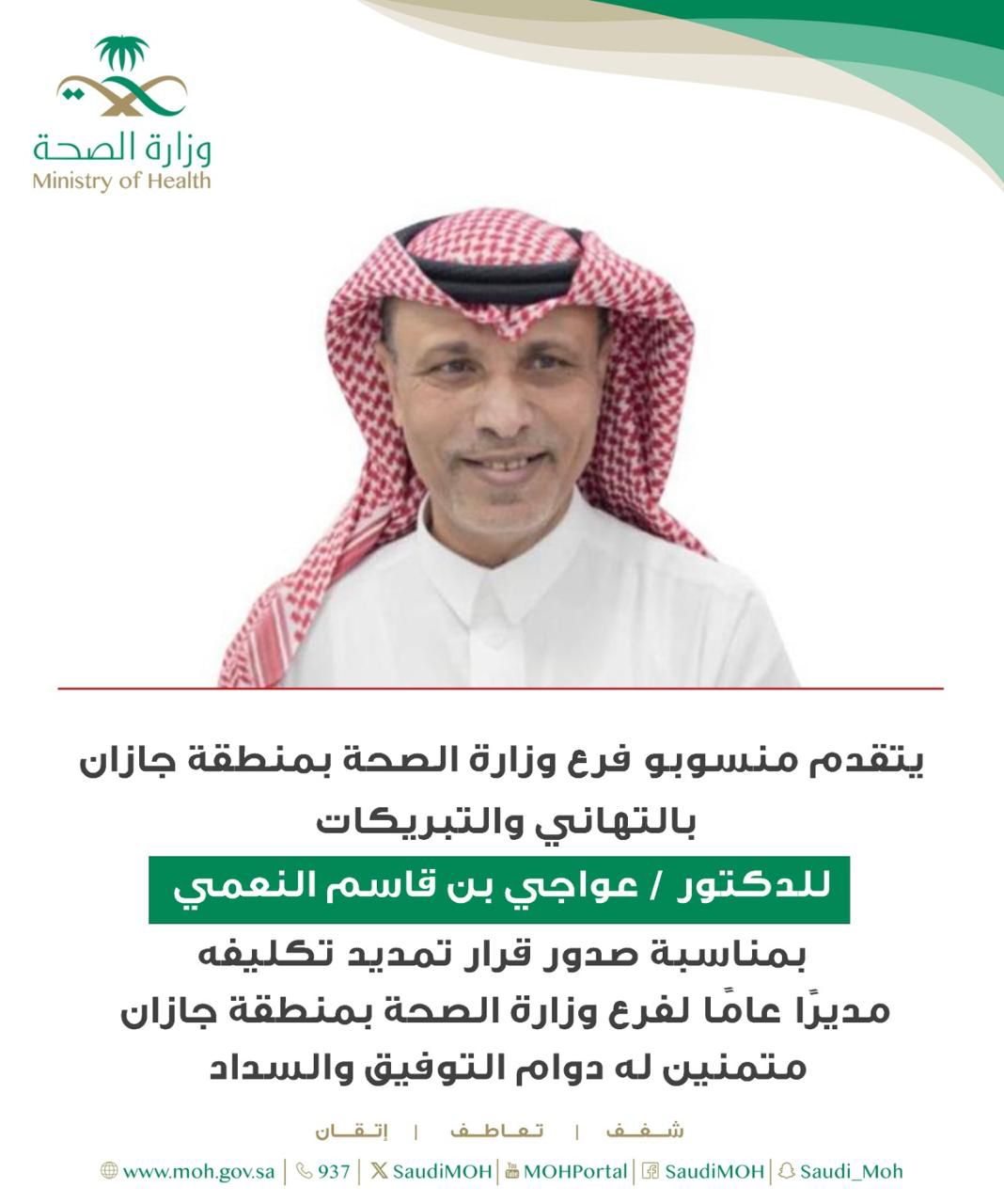 تمديد تكليف “د. عواجي النعمي” مديراً لفرع وزارة الصحة بجازان