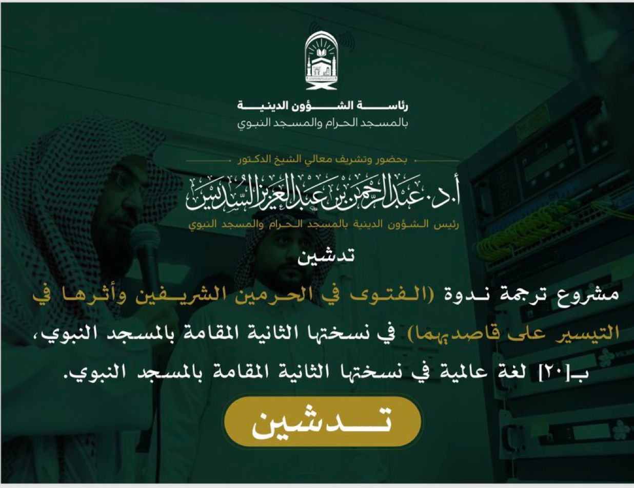 دشن معالي رئيس الشؤون الدينية بالمسجد الحرام والمسجد النبوي؛ الشيخ الدكتور: عبدالرحمن السديس؛ مشروع ترجمة ندوة “الفتوى في الحرمين الشريفين وأثرها في التيسير على قاصديهما”، بنسختها الثانية بعشرين لغة عالمية؛ حرصًا على إيصال رسالة ندوة الفتوى وأهدافها ومضامينها ومخرجاتها إلى المسلمين في أنحاء العالم.