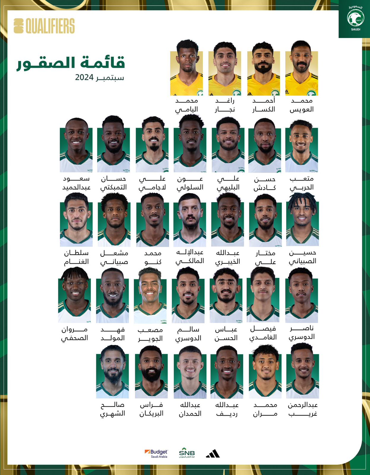 أعلن المدير الفني للمنتخب الوطني “روبرتو مانشيني” عن قائمة الأخضر استعدادًا لخوض الجولتين الأولى والثانية من الدور الثالث من التصفيات الآسيوية لكأس العالم 2026، ويستضيف الأخضر في الخامس من شهر سبتمبر القادم منتخب إندونيسيا على استاد مدينة الملك عبدالله الرياضية بجدة، فيما سيحل الأخضر ضيفًا على منتخب الصين في العاشر من شهر سبتمبر على استاد داليان سويوان .