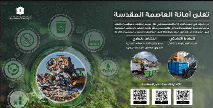 دعت أمانة العاصمة المقدسة الشركات المتخصصة في مجال نقل وجمع النفايات ومخلفات البناء إلى تقديم طلبات التأهيل، وذلك لخدمة القطاعين الإنشائي والتجاري وفقًا للاشتراطات والمعايير المعتمدة، بهدف الارتقاء بالخدمات المقدمة وضمان كفاءة أعمال النظافة. حيث يشمل النشاط الإنشائي نقل مخلفات البناء والأنقاض، في حين يشمل النشاط التجاري جمع ونقل نفايات المنشآت التجارية مثل الأسواق والفنادق والمحلات التجارية.