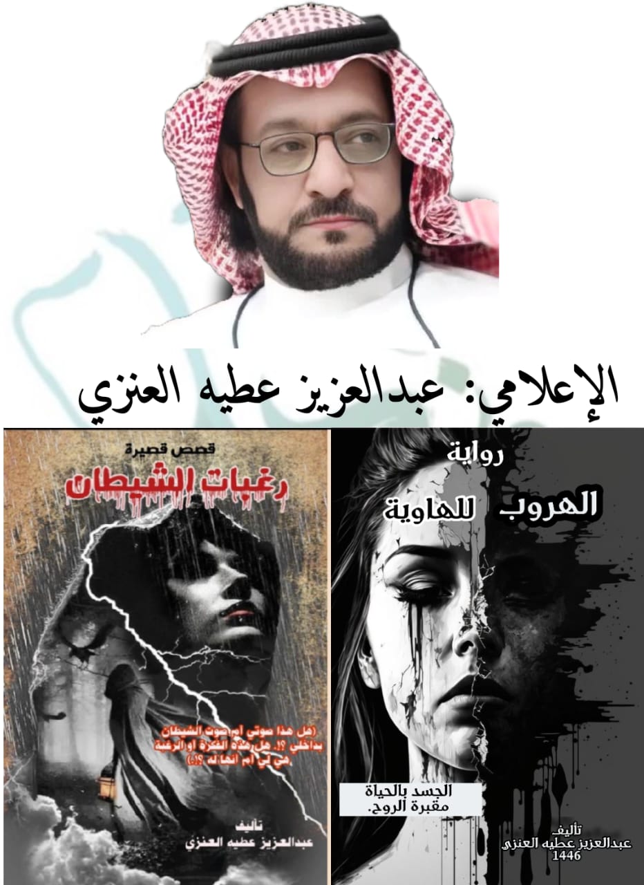 يستعد الكاتب والإعلامي: عبدالعزيز عطيه العنزي لإصدار كتابه الثاني (الهروب للهاوية) ، بعد موافقة الهيئة العامة لتنظيم الإعلام على إصدار الفسح بعد تصنيف العمل من الهيئة الفكرية.