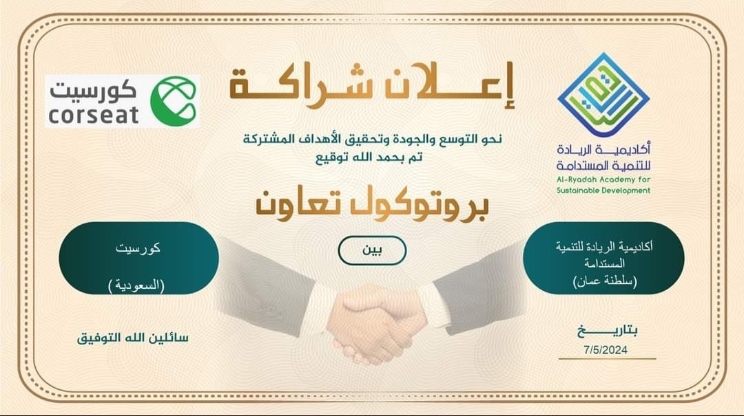بعد عدة اجتماعات تمت بين د.منال النجار ، رئيس أكاديمية الريادة للتنمية المستدامة و أ. شادي سليمان مدير تطوير الأعمال في كورسيت، تم الاتفاق على توقيع مذكرة تعاون بين المنشأتين، وذلك بهدف تنفيذ المشاريع والأنشطة المشتركة، مع التركيز على رفع الوعي الإداري والاقتصادي و العالم الرقمي و دعم وتعزيز ريادة الأعمال والتنمية المستدامة .