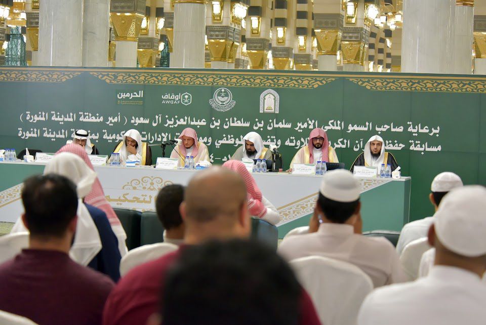 برعاية كريمة من صاحب السمو الملكي الأمير سلمان بن سلطان بن عبدالعزيز آل سعود (أمير منطقة المدينة المنورة ) ، أقيمت على فترتين صباحية ومسائية ، يوم السبت الماضي الموافق الخامس من أكتوبر 2024 مسابقة حفظ القرآن الكريم وتلاوته وتفسيره لموظفي وموظفات الإدارات الحكومية بمنطقة المدينة المنورة ، وذلك في المسجد النبوي للموظفين، ثم في مقرأة تعظيم الوحيين التاسعة لموظفات الادارات الحكومية ، بمشاركة 35 متسابق و متسابقة يمثلون عدداً من الإدارات الحكومية بالمدينة المنورة.
