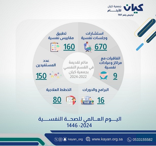 وأضافت البليخي إن شعار هذا العام جاء بعنوان ” نحو بيئة عمل معززة للصحة النفسية ” لذلك قمنا بتفعيله على الموظفات. مشيرة إلى أن قسم الصحة النفسية بجمعية كيان أصدر أيضا تقريرا شاملا عما قدمه خلال العام 2024م، حيث بلغ عدد الاستشارات والجلسات النفسية 670/ وتطبيق المقاييس النفسية 160/ وعدد الاتفاقيات مع المراكز والعيادات النفسية 9/ وعدد المستفيدين 150/ والبرامج والدورات 16/ والخطط العلاجية المقدمة بلغت 80 خطة علاجية.