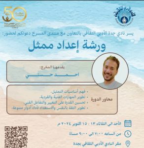 ضمن فعاليات منتدى المسرح ، يقيم النادي الأدبي الثقافي بجدة مساء اليوم الأحد 13 اكتوبر 2024 ، ورشة تدريبية بعنوان (ورشة إعداد ممثل) ، يقدمها المخرج أحمد حسني ، وتستمر لمدة ثلاثة أيام من السابعة حتى التاسعة مساءً بقاعة مكتبة النادي.