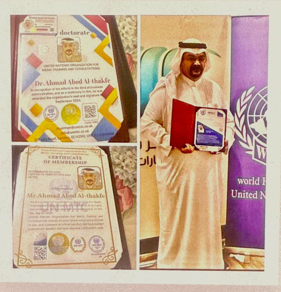 تعتبر الشهادات الفخرية والعضويات الدولية أحد أرقى أشكال التكريم التي تمنح للأفراد تقديراً لمساهماتهم وجهودهم البارزة في مجالات تخصصهم. وهذا التكريم لا يعبر فقط عن مدى تقدير المنظمات العالمية لتلك الجهود، بل يشكل أيضًا اعترافًا دوليًا بقيمة الأعمال التي تم تقديمها ومدى تأثيرها في المجتمعات. وفي هذا السياق، يبرز اسم الدكتور أحمد عبدالغني جعفر عابد الثقفي كأحد النماذج الرائدة في المملكة العربية السعودية التي نالت هذا الاعتراف الدولي، حيث حصل على دكتوراه فخرية في إدارة الأعمال من منظمة الأمم المتحدة للتدريب والاستشارات الإعلامية (UN MTC)، إلى جانب عضويته الدائمة في عدة هيئات تابعة للأمم المتحدة.