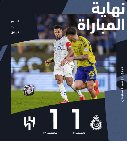 حسم التعادل الإيجابي بهدف لمثله مواجهة النصر بنظيره الهلال “ديربي الرياض”، التي جمعت الفريقين مساء أمس الجمعة، على ملعب الأول بارك بمدينة الرياض، وذلك ضمن منافسات الجولة التاسعة من دوري السعودي للمحترفين “روشن السعودي”.