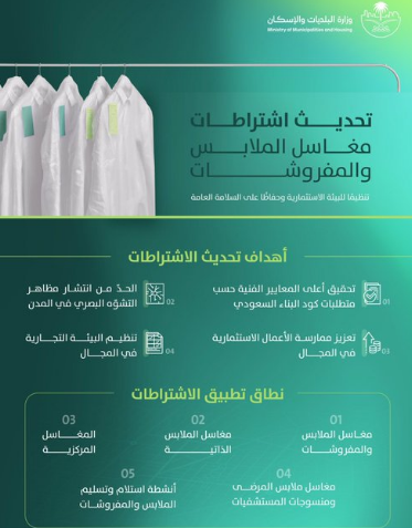 عرضت قناة الإخبارية تقريرا عن أبرز اشتراطات عمل مغاسل الملابس والمفروشات والتي حددتها وزارة الشؤون البلدية والقروية والإسكان.