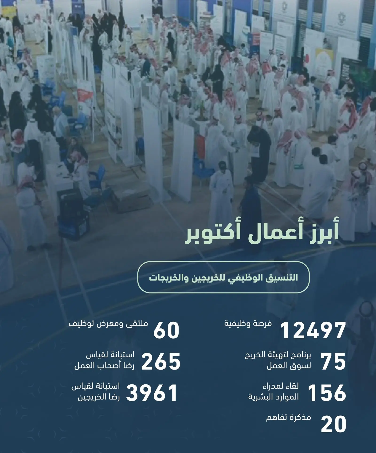 وأكد المتحدث الرسمي للمؤسسة فهد العتيبي أن إيجاد فرص وظيفية تتلاءم وتخصصات الخريجين والخريجات بالشراكة مع قطاع الأعمال هو أحد الأهداف التي تعمل المؤسسة على تحقيقها من خلال الإدارة العامة للتنسيق الوظيفي والمكاتب التابعة لها بمختلف المناطق، مضيفًا أنه خلال الشهر ذاته تم عقد (156) لقاء مع مدراء الموارد البشرية في قطاع الأعمال للتعرف على احتياجاتهم من التخصصات والمهارات، كما نفذت (75) برنامج تهيئة الخريجين لسوق العمل، إلى جانب إقامة (60) ملتقى ومعرض للتوظيف بمختلف المناطق، وتوقيع (20) مذكرة تفاهم بهدف توظيف الخريجين.