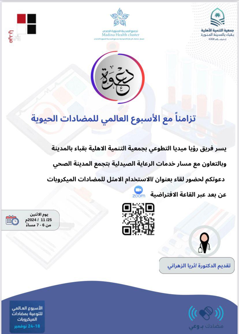 قدم فريق رؤيا ميديا التطوعي بجمعية التنمية الأهلية بقباء بالمدينة وبالتعاون مع مسار خدمات الرعاية الصيدلية بتجمع المدينة الصحي يوم أمس الاثنين 2024/11/25 لقاءً بعنوان “الاستخدام الأمثل لمضادات الميكروبات “وذلك تزامنًا مع الأسبوع العالمي للمضادات الحيوية قدمته د.ثريا الزهراني عبر القاعة الافتراضية من الساعة 6-7 مساءً.
