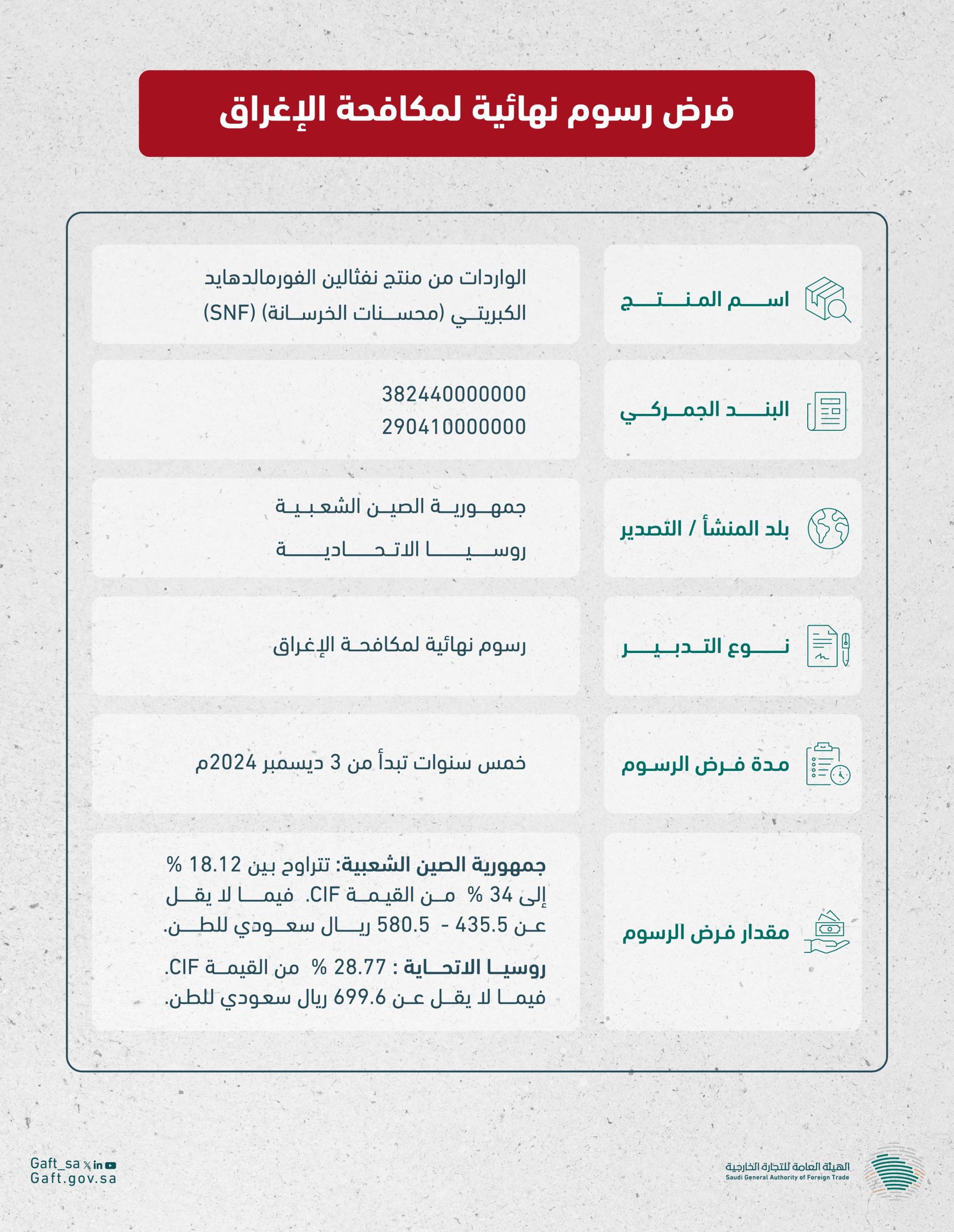 ويأتي قرار فرض رسوم مكافحة الإغراق النهائية وفقًا لنظام المعالجات التجارية في التجارة الدولية؛ الذي يهدف إلى حماية الصناعة المحلية من الممارسات التجارية غير العادلة في السوق السعودي.