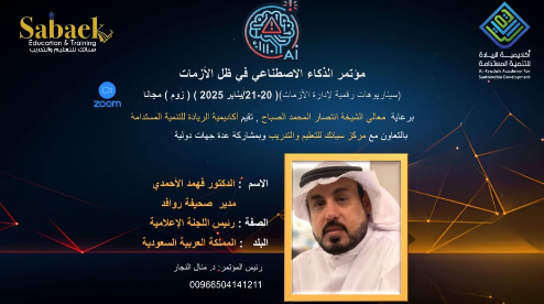 برعاية معالي الشيخة انتصار المحمد الصباح ، تقيم أكاديمية الريادة للتنمية المستدامة ، بالتعاون مع مركز سبائك للتعليم والتدريب ، وبمشاركة عدة جهان دولية ، مؤتمر الذكاء الاصطناعي في ظل الأزمات ، سيناريوهات رقمية لإدارة الأزمات ، ، خلال الفترة من ( ٢٠-٢١ يناير ٢٠٢٥) مجانا ، عبر برنامج زووم