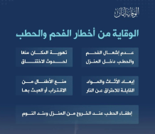 أكدت المديرية العامة للدفاع المدني ضرورة اتباع إرشادات وتعليمات السلامة عند استخدام الفحم والحطب للتدفئة، وشددت على أهمية إطفاء النار الناتجة عن الفحم والحطب عند الخروج من المنزل والحذر من النوم في أثناء اشتعالها؛ فاحتراقه ينتج غاز أول أكسيد الكربون، الذي يسبب الاختناق والموت -لا سمح الله- عند إشعالها في الأماكن المغلقة، وتنوه على مراقبة الأطفال ومنعهم من الاقتراب أو العبث بها.