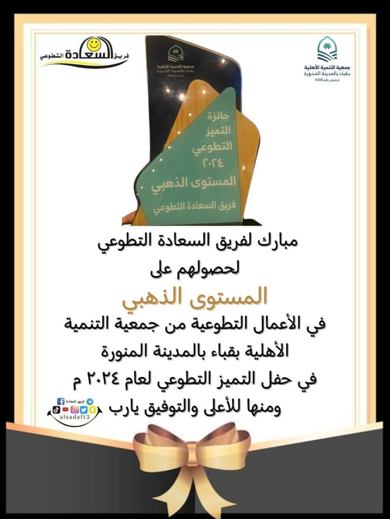 تُوِّج فريق السعادة التطوعي بالمستوى الذهبي لجائزة التميز التطوعي لعام 2024، التي تمنحها جمعية التنمية الأهلية بقباء في المدينة المنورة ؛ تقديرًا لإنجازاته اللافتة خلال العام الماضي.