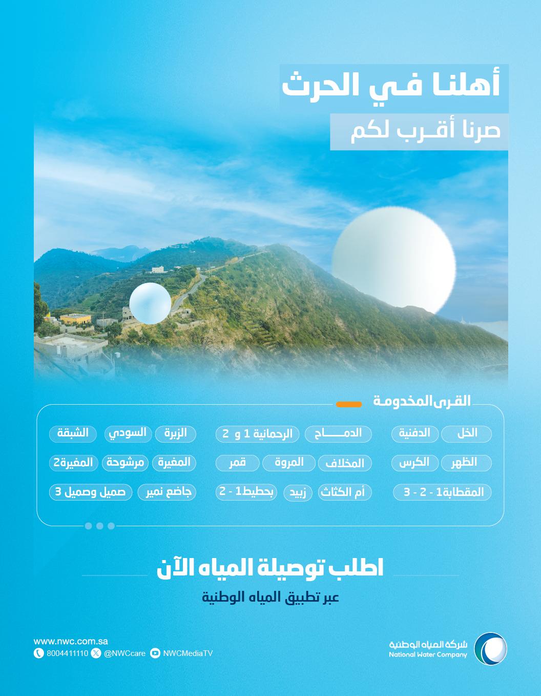 ودعت المياه الوطنية عملاءها في محافظ الحرث والقرى التابعة إليها (الخل –الدفنية -الدماح – الرحمانية 1 و 2 – الزبرة – السودي – الشبقة– الظهر – الكرس – المخلاف – المروة – قمر– المغيرة – المغيرة2 – المقطابة1 و 2 و 3 – أم الكثاث -بحطيط1 و2 – جاضع نمير – صميل وصميل 3 – زبيد – مرشوحة) طلب الخدمة عبر قنواتها الرسمية، سواء من خلال تطبيقها الإلكتروني على الهواتف الذكية، أو فرعها الإلكتروني (e.nwc.com.sa).