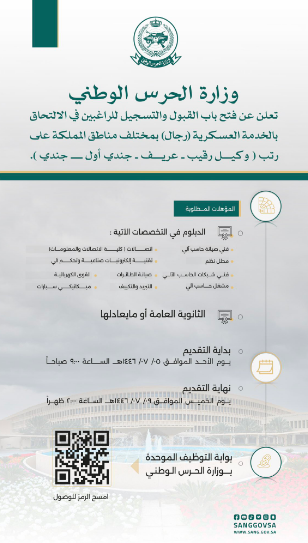 أعلنت وزارة الحرس الوطني عن فتح باب القبول والتسجيل من الأحد القادم، للراغبين في الالتحاق بالخدمة العسكرية للرجال من حملة الثانوية العامة أو مايعادلها بمختلف مناطق المملكة، وفق الرتب والتخصصات التالية: ( وكيل رقيب، عريف، جندي أول ، جندي ) .