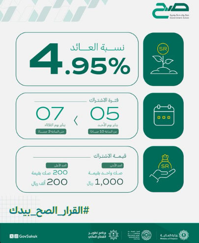 أعلنت منصة “صح”، عن بدء أول إصدارات “صكوك صح” الحكومية لعام 2025 المخصّصة للأفراد اليوم 5 يناير.