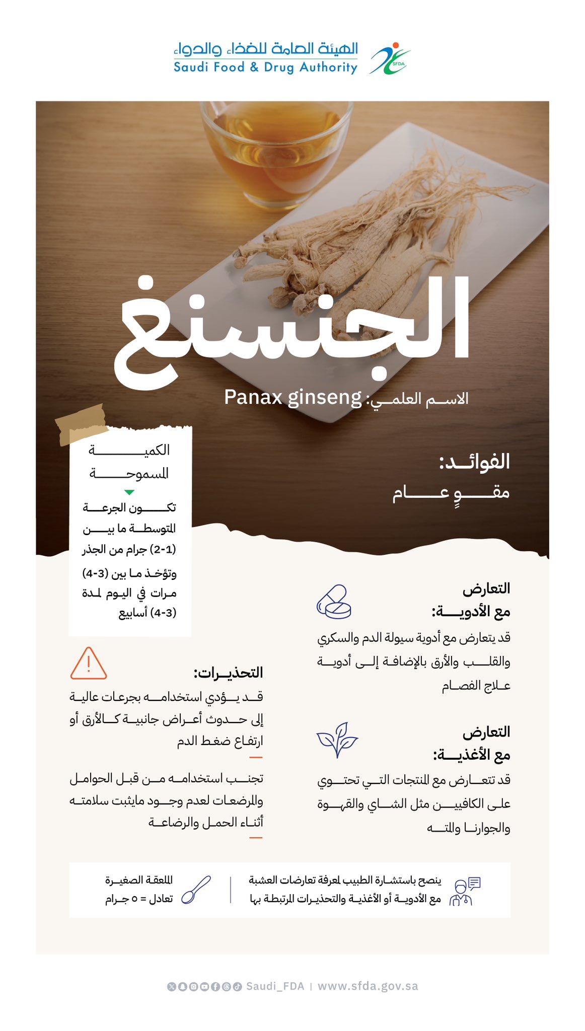 وأكدت الهيئة أن “الجنسنغ” والمعروفة علميًا باسم (Panax ginseng) تستخدم في الطب البديل كمقوٍ عام، حيث تزيد من الطاقة وتقاوم الإجهاد، وذلك إذا استُخدمت ضمن الكميات اليومية المسموح بها، والتي تبلغ الجرعة المتوسطة لها ما بين (1-2) جرام من الجذر، وتؤخذ ما بين (3-4) مرات في اليوم لمدة (3-4) أسابيع، مع الأخذ بعين الاعتبار أن الملعقة الصغيرة تعادل (5 جرامات)، مشددةً على أن الأعشاب من المواد التي ينبغي استخدامها بحذر مثل أي دواء آخر، كما يجب التعامل بحرص مع الادعاءات حول سلامة المستحضرات العشبية التي لا تدعمها أدلة موثقة، ويُنصح باستشارة الطبيب قبل استخدامها، حيث إنها قد تتعارض مع بعض الأدوية أو الأغذية.