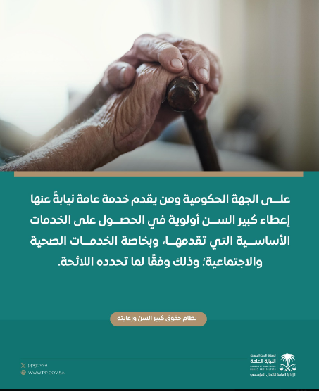 ووفقا لما نشرته النيابة العامة، عبر حسابها في منصة إكس، فإنه ينص نظام حقوق كبير السن على أنه على الجهة الحكومية ومن يقدم خدمة عامة نيابة عنها إعطاء كبير السن أولوية في الحصول الخدمات الأساسية التي تقدمها، وبخاصة الخدمات الصحية والاجتماعية، وفقا ما تحدده اللائحة.