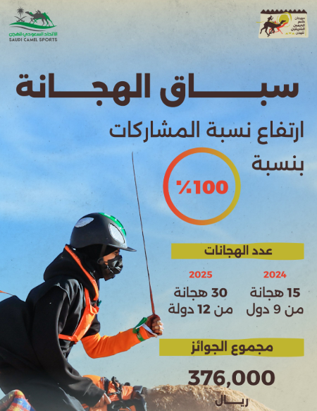 ارتفعت نسبة مشاركة المرأة في سباق الهجانة ضمن مهرجان خادم الحرمين الشريفين 2025 بنسبة 100% مقارنة بالنسخة الأولى العام الماضي، مما جعل اللجنة المنظمة للمهرجان تضيف شوطًا ثانيًا نظرًا للإقبال المتزايد، من بينهم 18 هجانة سعودية.