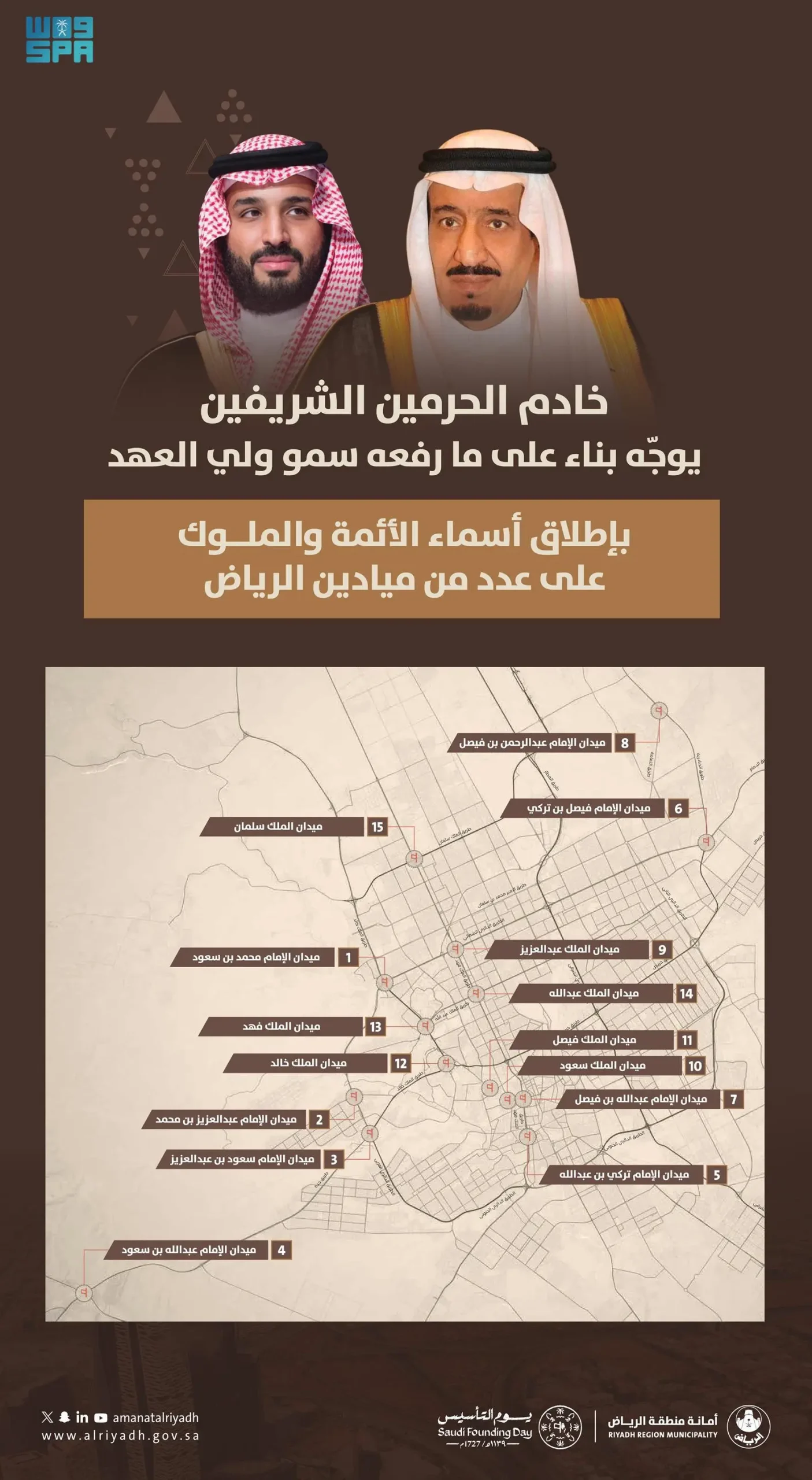بناء على ما رفعه سمو ولي العهد ..خادم الحرمين يوجّه بإطلاق أسماء أئمة وملوك الدولة السعودية على 15 ميدانًا بمدينة الرياض