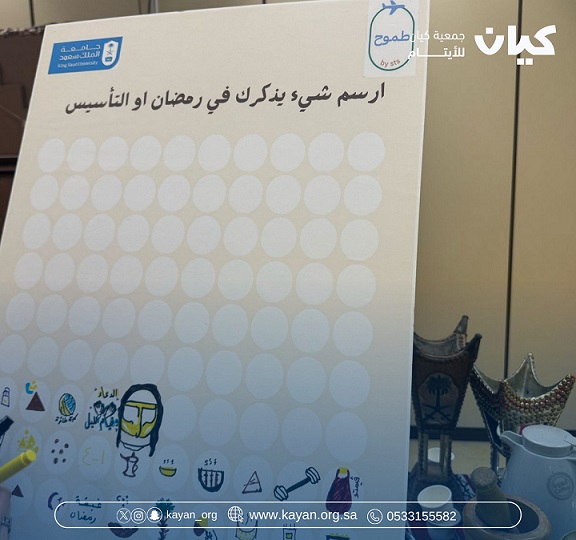 بدعوة من كلية السياحة والآثار بجامعة الملك سعود والنادي الثقافي الاجتماعي شاركت جمعية كيان للأيتام ذوي الظروف الخاصة بركن تعريفي لمدة ثلاثة أيام بمناسبة فعالية يوم التأسيس ونور رمضان الذي أقامته الكلية بالجامعة.