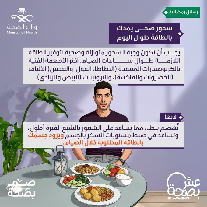 قالت وزارة الصحة، إنَّ السحور الصحي، يؤدي إلى إمداد الجسم بالطاقة طوال اليوم، بحيث تكون وجبة السحور متوازنة وصحية لتوفير الطاقة اللازمة طوال ساعات الصيام.