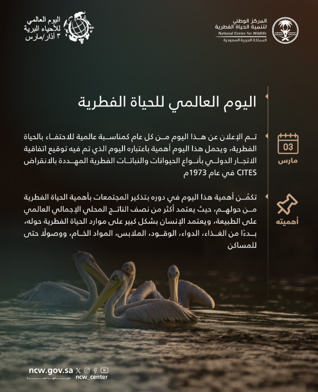 يُمثِّل اليوم العالمي الذي تحتفي به دول العالم ومن ضمنها المملكة في 3 مارس من كل عام؛ إثراءً للتنوع الأحيائي وأهميته في حياة الإنسان، ومدى الحاجة لتكثيف الجهود لحماية الحياة الفطرية والمحافظة عليها والحد من الأنشطة الضارة ذات التأثيرات السلبية اقتصاديًا وبيئيًا واجتماعيًا؛ وذلك من خلال العديد من الفعاليات المتنوعة والأنشطة إلى تكريس مبدأ الشـراكة مـن أجل المحافظة على الحياة الفطرية مع جميع الجهات ذات العلاقة والرسائل التوعوية لتعظيم الأثر المنشود.
