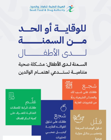 تشارك الهيئة العامة للغذاء والدواء المجتمعَ أهم الممارسات الصحية للوقاية من سمنة الأطفال، بالتزامن مع اليوم العالمي لمكافحة السمنة، الذي يُصادف الرابع من مارس سنويًا؛ وانطلاقًا من دورها في تعزيز الوعي الصحي والوقاية من الأمراض المرتبطة بأنماط الحياة الغذائية، وتماشيًا مع مستهدفات برنامج تحول القطاع الصحي أحد برامج رؤية المملكة 2030.