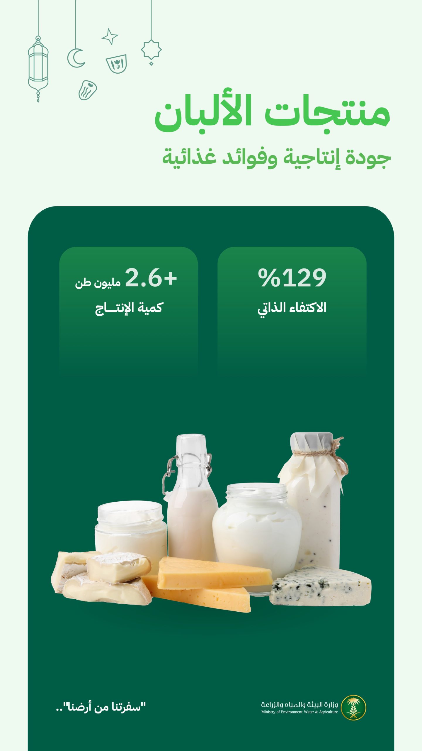 كشفت وزارة البيئة والمياه والزراعة، أن منتجات الألبان تُسجّل وفرة ملحوظة في الأسواق، بإنتاج يتجاوز (2.6) مليون طن؛ مما يعكس دوره الحيوي في تلبية احتياجات المستهلكين خلال شهر رمضان المبارك.