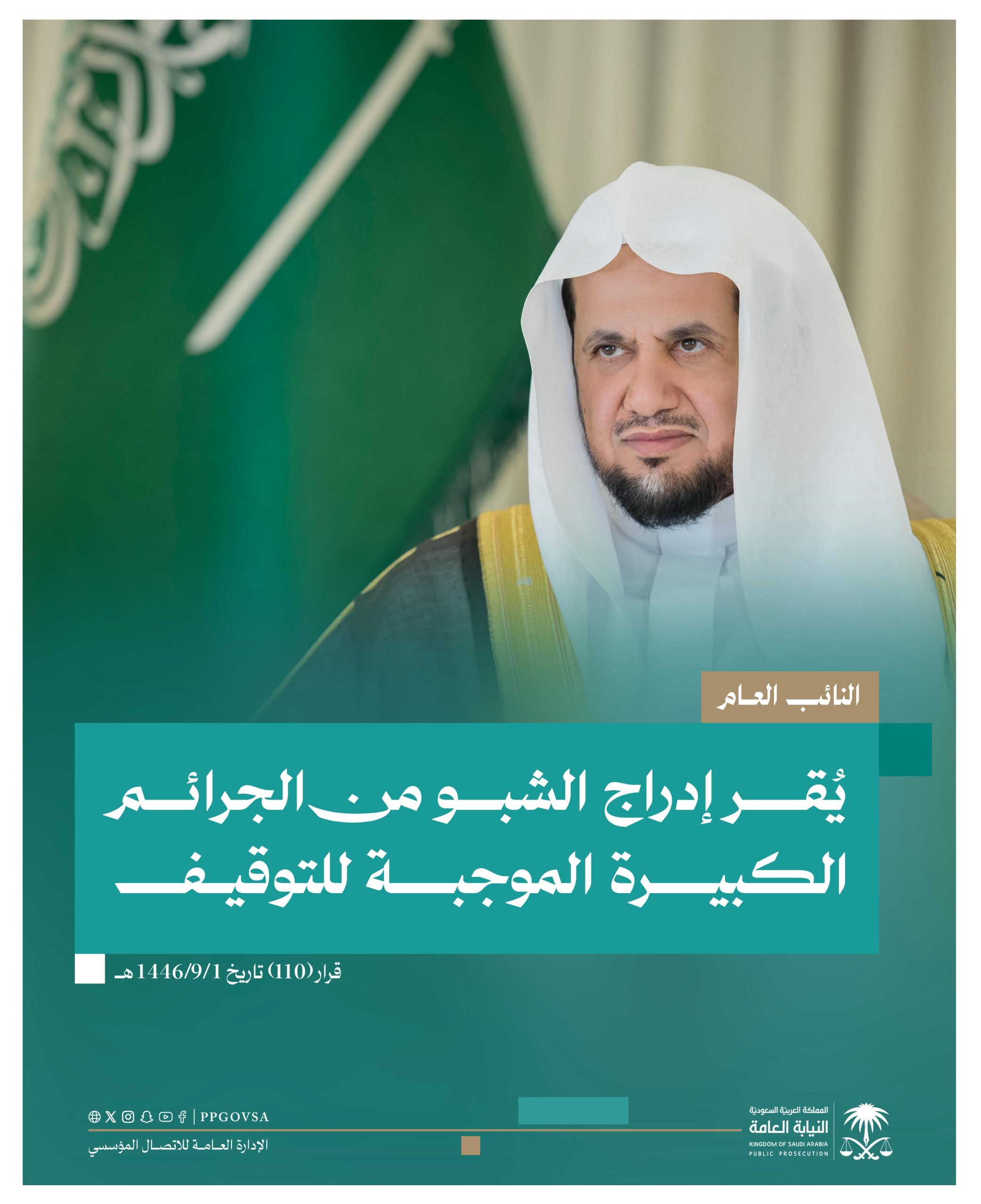 وقد صدر قرار معاليه رقم (110) وتاريخ 1446/9/1هـ بإضافة فقرة رقم (26) إلى قرار معاليه رقم (1) وتاريخ 1442/1/1هـ لتصبح بالنص الآتي (تُعد جميع الأوصاف الجرمية المتصلة بمادة الميثامفيتامين (الشبو) من الجرائم الكبيرة الموجبة للتوقيف. ويُقصد بالأوصاف الجرمية المشار لها في القرار: جريمة تعاطي الشبو والجرائم المتصلة به، كالحيازة أو التهريب أو الجلب أو التلقي أو الإحراز أو التسلم أو الشراء أو النقل، حال كان القصد منها التعاطي أو الاستعمال الشخصي، إضافةً إلى جريمة الشروع في تصنيع الشبو.