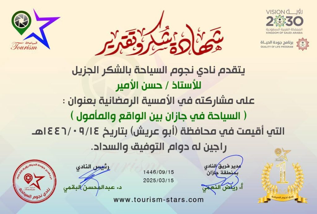 تلقى الأديب حسن الأمير شهادة شكر وتقدير من سعادة رئيس نادي نجوم السياحة الدكتور عبدالمحسن البقمي ؛ وذلك نظير مشاركته في الأمسية الرمضانية ، والتي أقيمت في محافظة أبوعريش بتاريخ ١٤ / ٩ / ١٤٤٦هـ ، والتي كانت بعنوان (السياحة في جازان بين الواقع المأمول).
