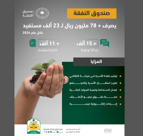 أسهم صندوق النفقة في وزارة العدل في استقرار العديد من الأسر ماليًا عبر الانتظام في صرف النفقة الشهرية دون تأخير، حيث قام خلال عام 2024 بصرف أكثر من 78 مليون ريال لأكثر من 23 ألف مستفيد.