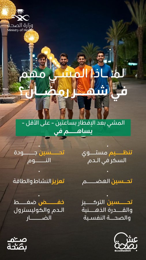 وأوضحت الوزارة في منشور توعوي، عبر منصة «إكس» في حملة «عش بصحة»، أن «المشي بعد الإفطار بساعتين – على الأقل -يساهم في تنظيم مستوي السكر في الدم، وتحسين جودة النوم، وتحسين الهضم، وتعزيز النشاط والطاقة، وكذلك يساعد في تحسين التركيز والقدرة الذهنية والصحة النفسية، وخفض ضغط الدم والكوليسترول الضار».
