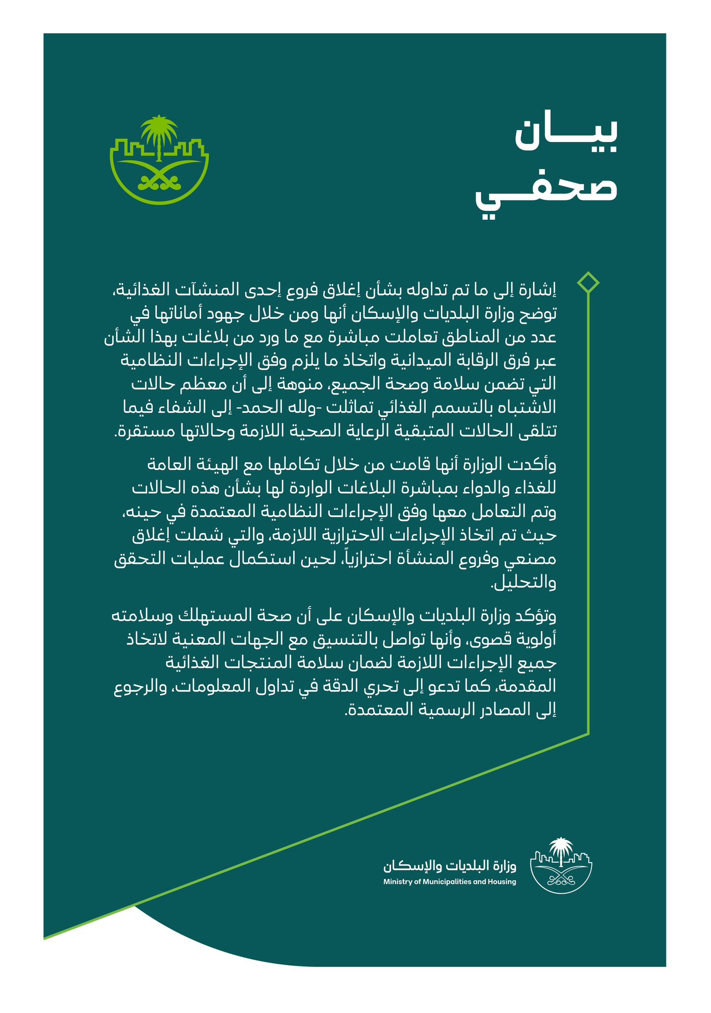 “البلديات والإسكان” تصدر بيان توضيحي بشأن إغلاق فروع إحدى المنشآت الغذائية.