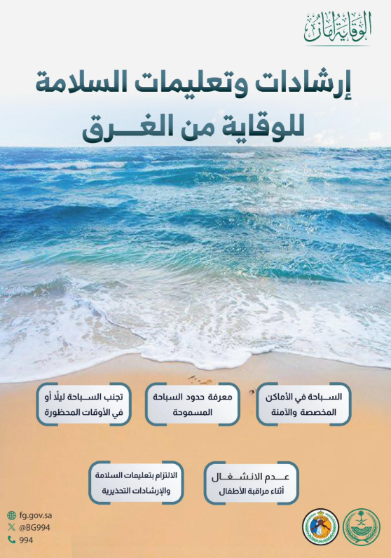 دعت المديرية العامة لحرس الحدود مرتادي الشواطئ في جميع أنحاء المملكة إلى التقيد بإرشادات السلامة البحرية، وتجنب السباحة في المواقع غير المخصصة لذلك، ومرافقة الأطفال أثناء وجودهم على الشاطئ، واتخاذ التدابير الاحترازية اللازمة للحفاظ على سلامة الجميع.