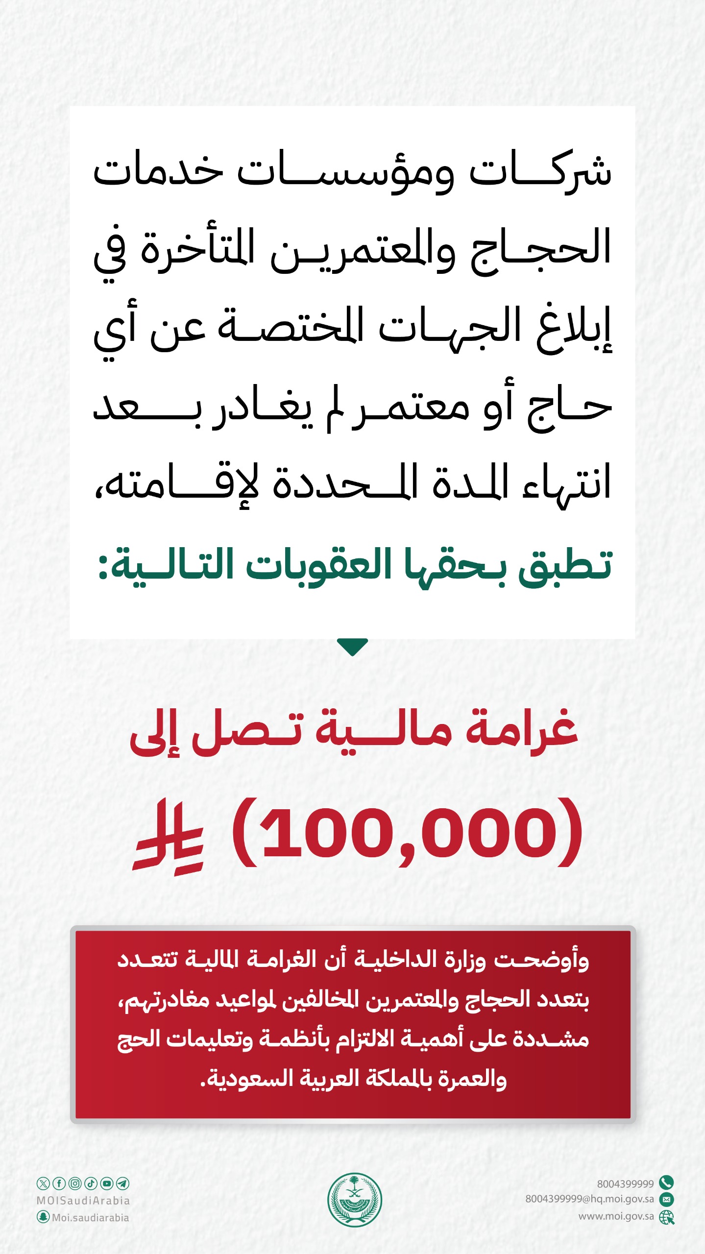 وزارة الداخلية: غرامة تصل إلى (100,000) ريال في حال تأخر الإبلاغ عن أي حاج أو معتمر لم يغادر بعد انتهاء المدة المحددة لإقامته