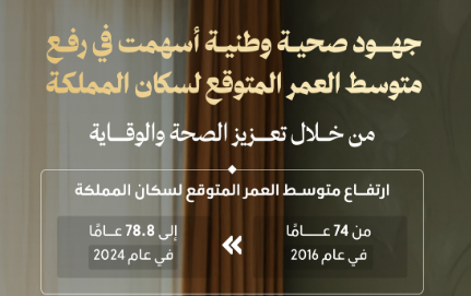 وكثفت المنظومة الصحية -تحت إشراف وزارة الصحة- المبادرات النوعية والحملات التوعوية؛ لترسيخ الأنماط السليمة والسلوكيات الصحية ونشر ثقافة المشي، والتشجيع على الممارسات اليومية الصحية؛ ما أسهم في تحسين مؤشرات الصحة العامة وجودة الحياة، ومهد الطريق لتحقيق الهدف الإستراتيجي برفع متوسط العمر المتوقع إلى 80 عاماً بحلول 2030.