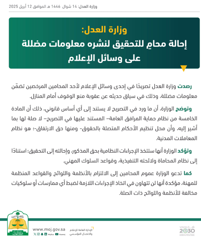 وزارة العدل: إحالة محامٍ للتحقيق لنشره معلومات مضللة على وسائل الإعلام.