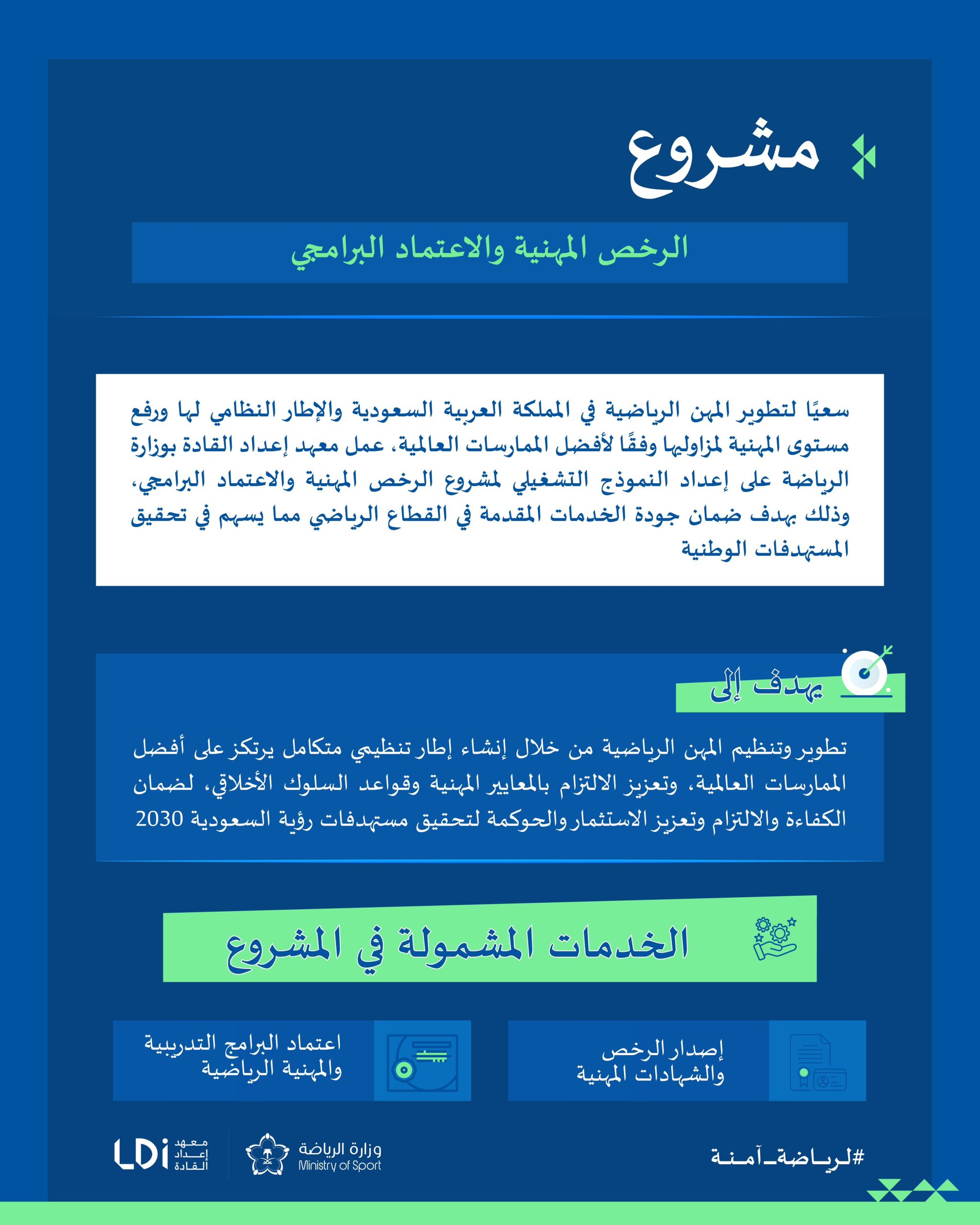 أعلنت وزارة الرياضة، ممثلة بمعهد إعداد القادة، اليوم، إطلاق مشروع “الرخص المهنية والاعتماد البرامجي”؛ الذي يُعد أحد مبادرات الوزارة الهادفة لتطوير وتنظيم القطاع الرياضي، من خلال منح الرخص والشهادات المهنية والاعتماد البرامجي للتدريب المهني الرياضي، وفق أعلى المعايير المتوافقة مع أفضل الممارسات العالمية.