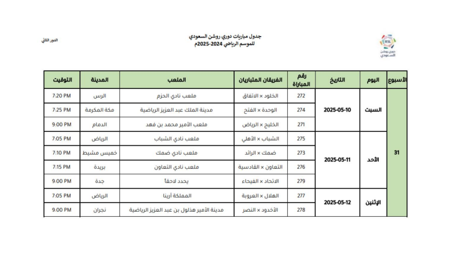 أعلنت رابطة الدوري السعودي للمحترفين عن اعتماد مواعيد ومواقع إقامة مباريات الجولة الحادية والثلاثين من دوري روشن السعودي للموسم الرياضي 2024-2025، وذلك استناداً إلى قرار إدارة المسابقات رقم (م/20/2025).