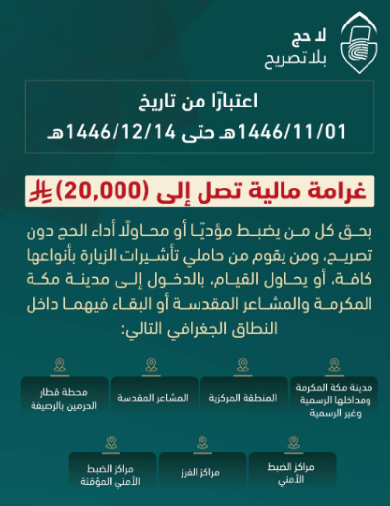 أكدت وزارة الداخلية تطبيق عقوبة بغرامة مالية تصل إلى (20,000) ريال بحق من يضبط مؤديًا أو محاولًا أداء الحج دون تصريح، ومن يقوم من حاملي تأشيرات الزيارة بأنواعها كافة، أو يحاول القيام بالدخول إلى مدينة مكة المكرمة والمشاعر المقدسة أو البقاء فيهما، داخل النطاق الجغرافي لمدينة مكة المكرمة ومداخلها الرسمية وغير الرسمية والمنطقة المركزية والمشاعر المقدسة ومحطة قطار الحرمين بالرصيفة ومراكز الضبط الأمني ومراكز الفرز ومراكز الضبط الأمني المؤقتة، وذلك اعتبارًا من 1/ 11/ 1446هـ حتى 14/ 12/ 1446هـ.