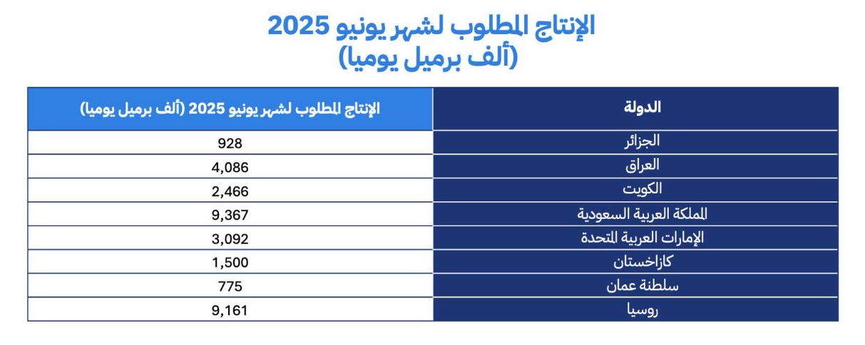 وفي ضوء أسس السوق الإيجابية الحالية، كما يتضح من انخفاض المخزونات البترولية، وبناء على ما اتفق عليه في اجتماع 5 ديسمبر 2024م بشأن الاستعادة التدريجية والمرنة لتعديلات الإنتاج التطوعية البالغة 2.2 مليون برميل يوميًا اعتبارًا من 1 أبريل 2025م، قررت الدول المشاركة تنفيذ تعديل في الإنتاج قدره 411 ألف برميل يوميًا في شهر يونيو 2025م مقارنة بمستوى الإنتاج المطلوب في مايو 2025م، وهو ما يعادل ثلاث زيادات شهرية، كما هو موضح في الجدول المرفق.