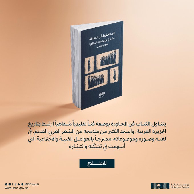 أصدرت وزارة الثقافة كتابًا بعنوان “فن المحاورة في المملكة.. دراسة في تاريخ الممارسة وواقعها”, الذي يأتي في إطار جهودها في توثيق الفنون الأدائية بالمملكة معرفيًا، وحفظها وفق منهجية بحثية رصينة ومُعمّقة.