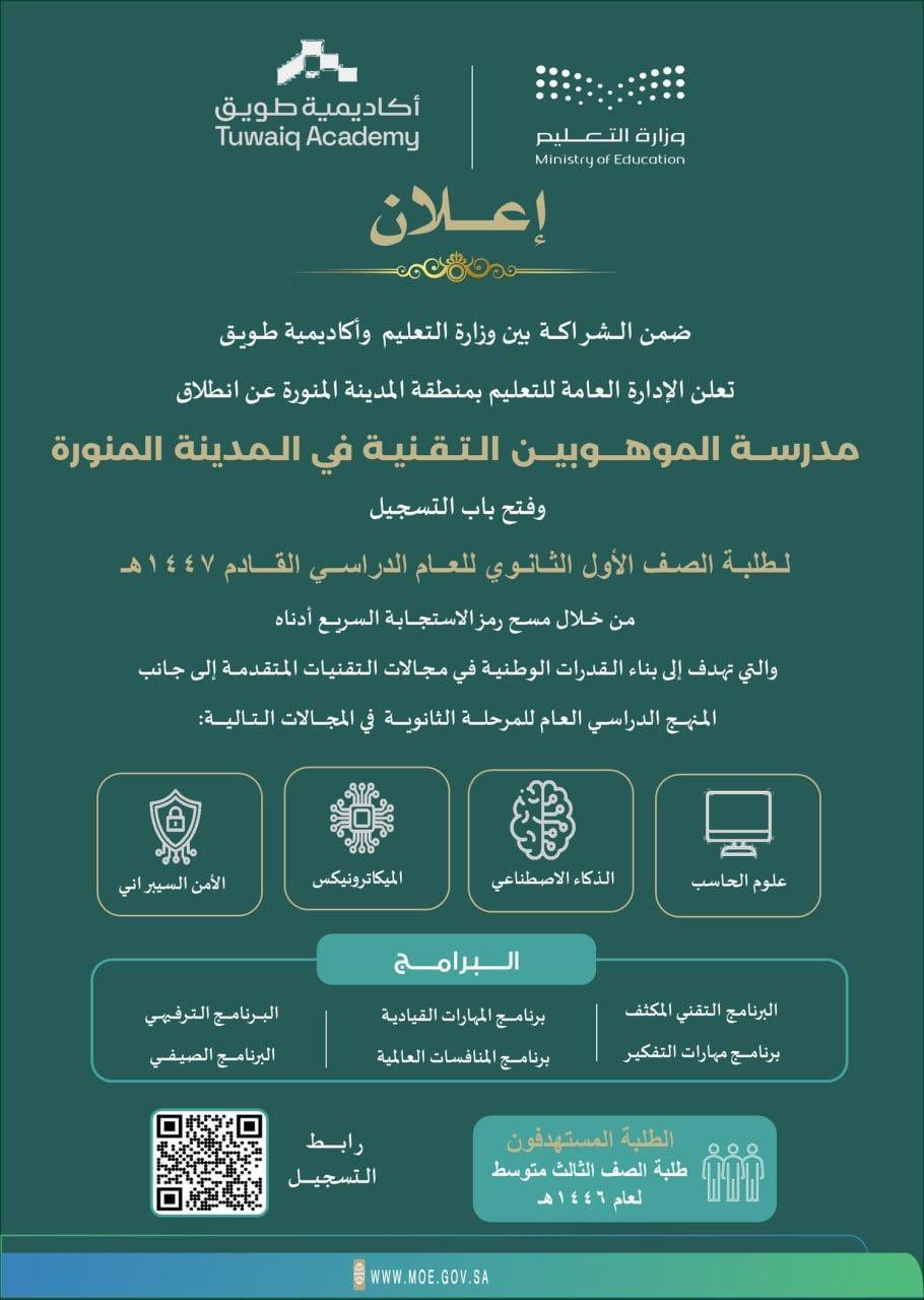 أعلنت الإدارة العامة للتعليم بمنطقة المدينة المنورة، افتتاح مدرسة الموهوبين التقنية، وبدء استقبال طلبات التسجيل لطلاب الصف الأول الثانوي للعام الدراسي القادم 1447هـ.