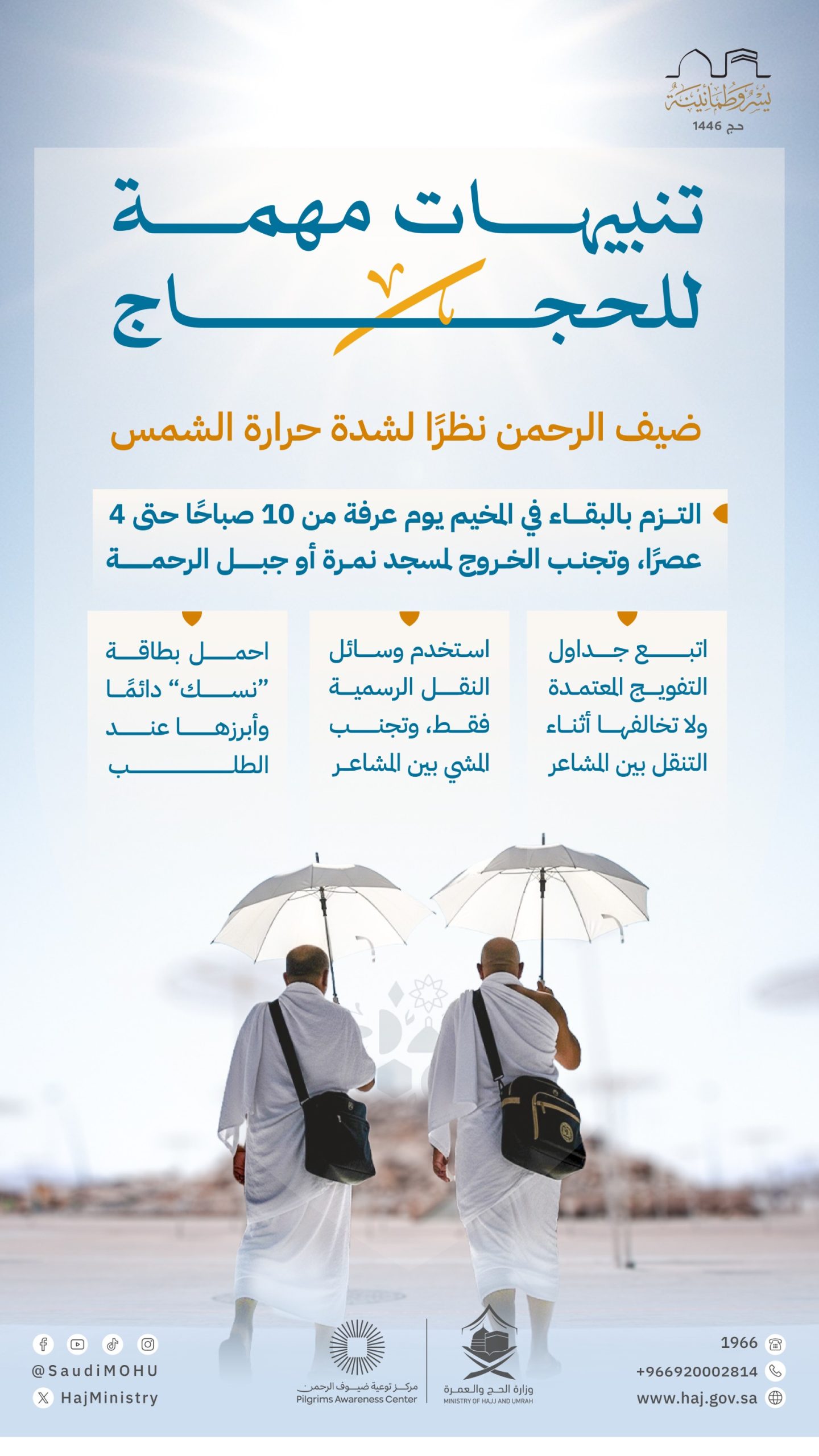 وتأتي هذه التوجيهات ضمن جهود وزارة الحج والعمرة؛ لتعزيز سلامة الحجاج وراحتهم، وتقديم تجربة حج ميسّرة ومنظمة، تعكس تكامل العمل المشترك بين الجهات المشاركة، والاهتمام المتواصل من قيادة المملكة بخدمة ضيوف الرحمن على أعلى مستوى من الكفاءة والجودة.