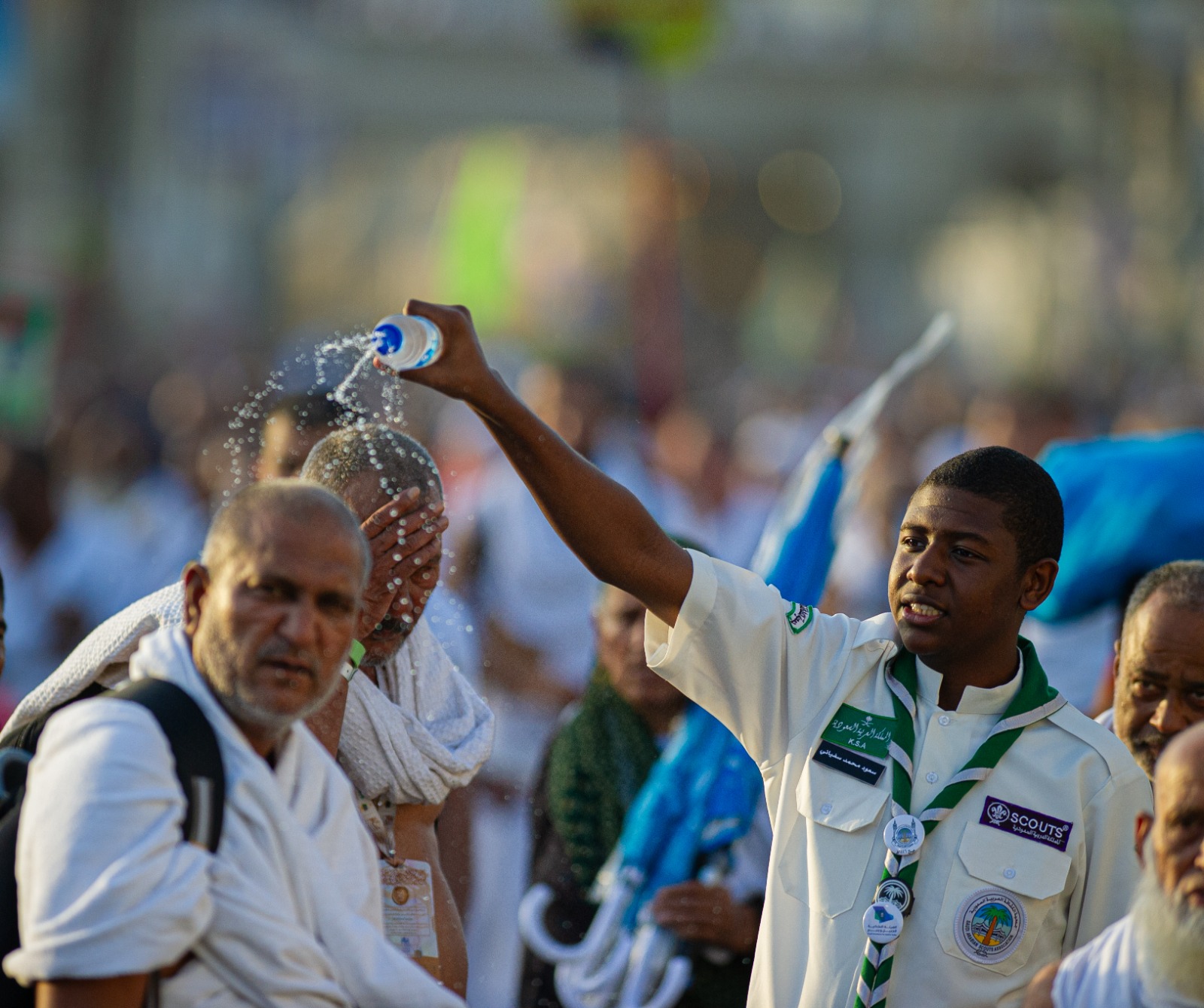 وسط جموع الحجاج المتدفقة في مشعر منى، وتحت شمس تلامس حرارة لهيبها الـ44 درجة مئوية، لم يكن المشهد المعتاد لحركة الحجيج وحده هو اللافت، بل أولئك الفتية بزيهم الكشفي، يتحركون بخفة، يحملون في أيديهم عبوات الماء ويطلقون رذاذها على رؤوس الحجاج المتعبين.