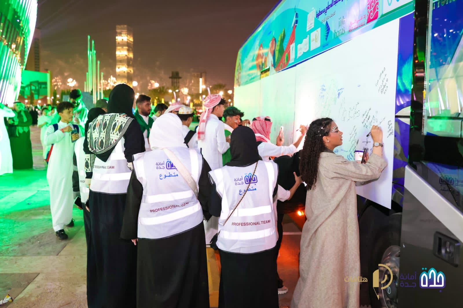 نفذت إدارة الاتصال المجتمعي في وكالة خدمة المجتمع بأمانة جدة بمناسبة اليوم الوطني الـ 93؛ مبادره هي الأولى من نوعها على مستوى المملكه والخليج وبفكره خارج الصندوق تماماً، وذلك بجمع 93 ألف كلمه كتبها المواطنون والمواطنات والمقيمين وجميع افراد المجتمع الذين شاركوا من خلالها بكتابة عبارات الولاء والانتماء والحب للقيادة والوطن على ثلاث حافلات كانت متواجده بالمواقع الحيويه الثلاث بالمدينة (واجهة روشن البحرية، رد سي مول، وجدة بارك مول).